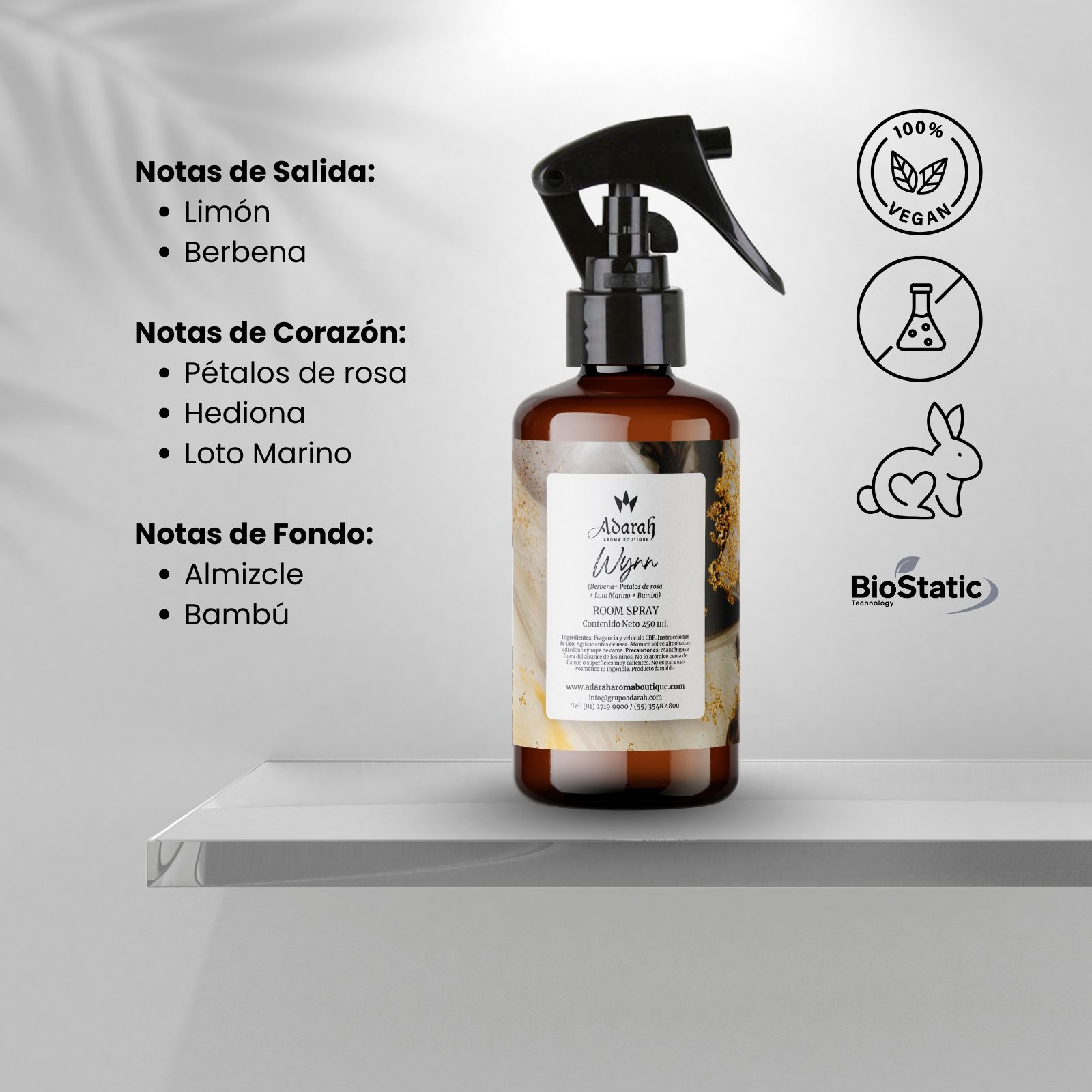 Wynn: Inspirado en el Hotel WYNN, este aroma es cálido y estimulante, promoviendo un ambiente tranquilo y optimista. Es una fresca mezcla floral ligera y fresca, con notas altas de Crisp Marine Accord, verbena de limón y un acorde de lluvia brumosa.